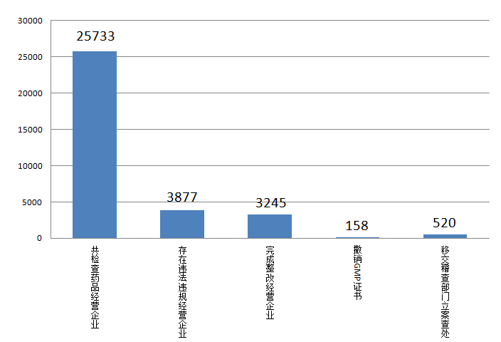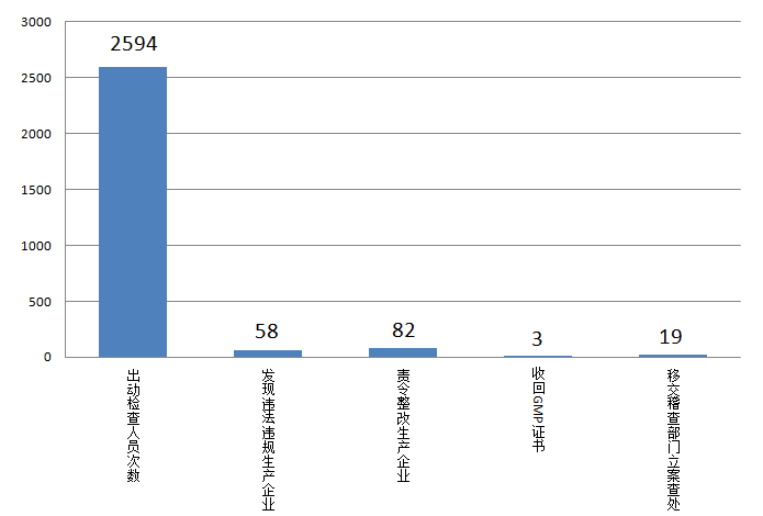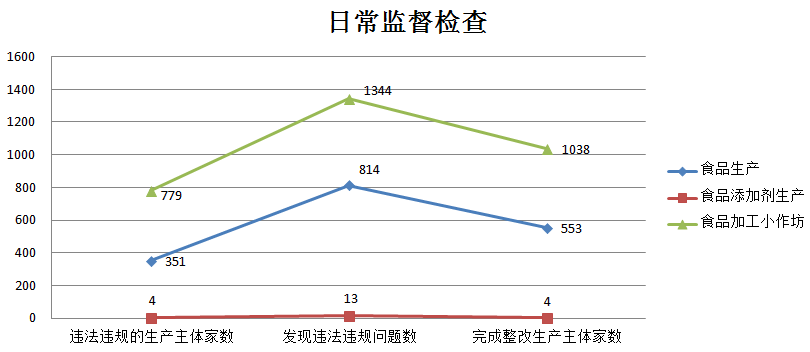 日常监督检查中发现违法违规的生产主体数1134家次,其中食品生产企业351家次,食品添加剂生产企业4家次,食品加工小作坊779家次;发现违法违规问题数2171个,其中食品生产企业814个,食品添加剂生产企业13个,食品加工小作坊1344个;完成整改生产主体数1595家次,其中食品生产企业553家次,食品添加剂生产企业4家次,食品加工小作坊1038家次。