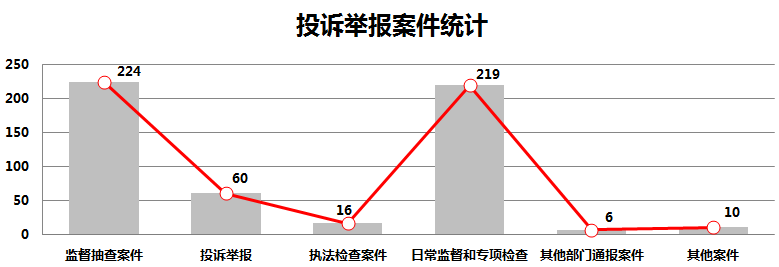 从案件来源看,来源于投诉举报的案件60件,来源于监督抽查的案件224件,来源于执法检查的案件16件,来源于日常监督和专项检查的案件219件,其他部门通报的案件6件,其他的案件10件。