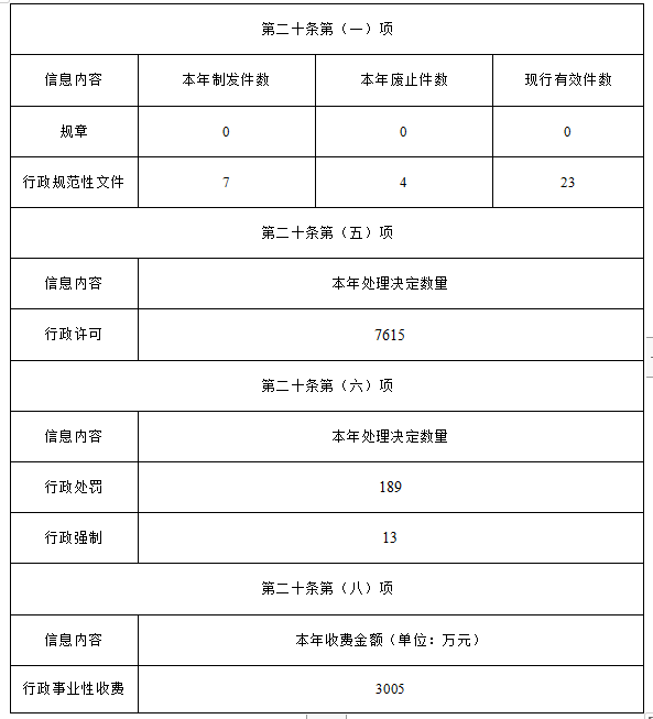 (三)政府信息管理情况。严格执行省局利来囯际管理办法等规定,进一步健全内容审核和信息发布审核机制,压紧压实各方审查责任,对拟公开的内容严格进行规范性审核和保密审查。持续动态更新、规范发布规范性文件及有关工作文件,进一步做好涉药品监管建议提案答复、规划、许可、部门预决算、行政执法等法定政府信息的主动公开工作。2023年,制发行政性规范文件7件,废止4件,现行有效23件。